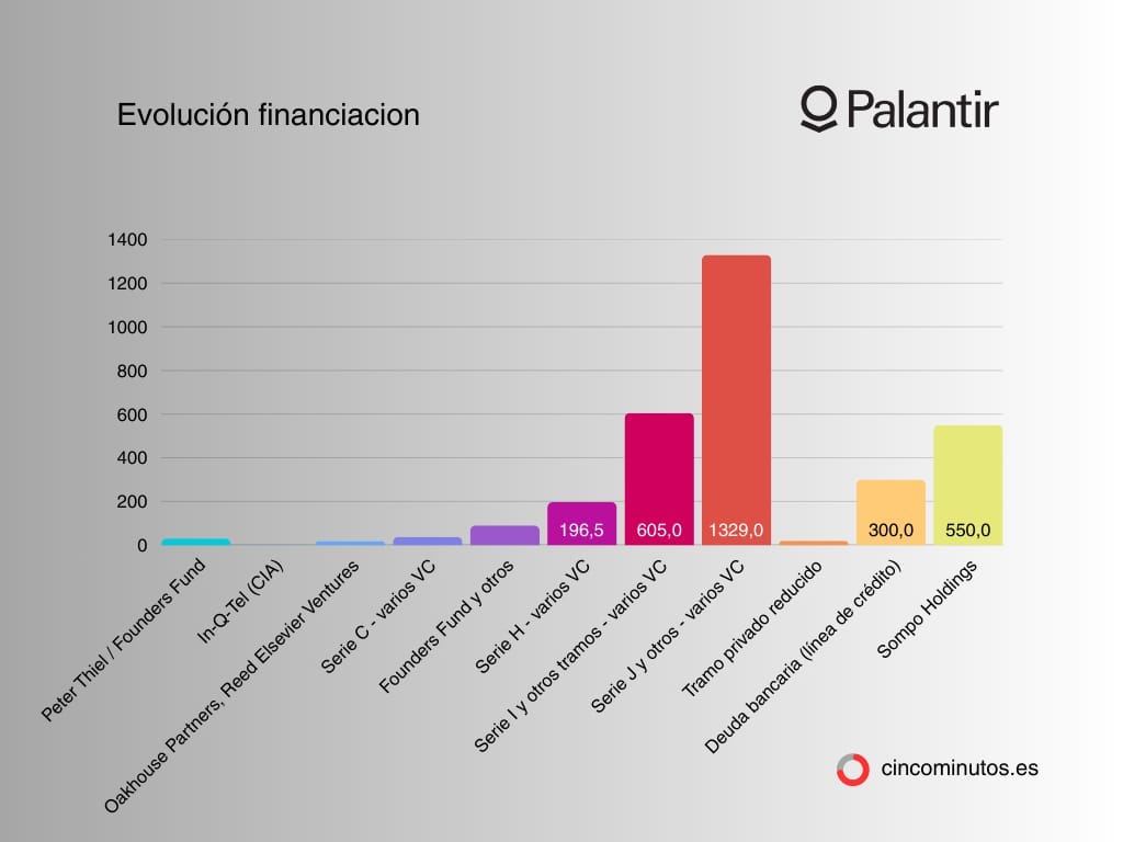 Entre 2003 y 2006, Thiel inyectó unos 30 millones —parte vía Founders Fund— y llegaron las primeras rondas: 7,5 millones de Oakhouse Partners y 10,5 de Reed Elsevier Ventures. La entrada de In-Q-Tel, el fondo de la CIA, con unos 2 millones, valió más por credibilidad que por dinero. En 2008, la valoración era ya de 400 millones tras una Serie C de 36,8 millones. Dos años después, una ronda de 90 millones la llevó a 730 millones.