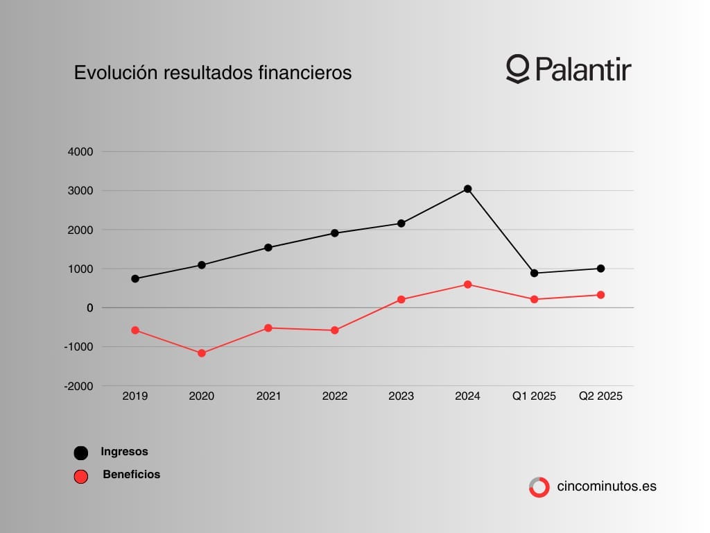 El año 2024 confirmó que no era un espejismo. Los ingresos se dispararon a 3.045 millones (+41% interanual), con un beneficio neto de 595 millones y un margen operativo ajustado por encima del 25%. Para entonces, Palantir ya se había ganado la etiqueta de “compañía de software rentable” y comenzó a entrar en los radares de grandes fondos de inversión que antes la habían descartado.