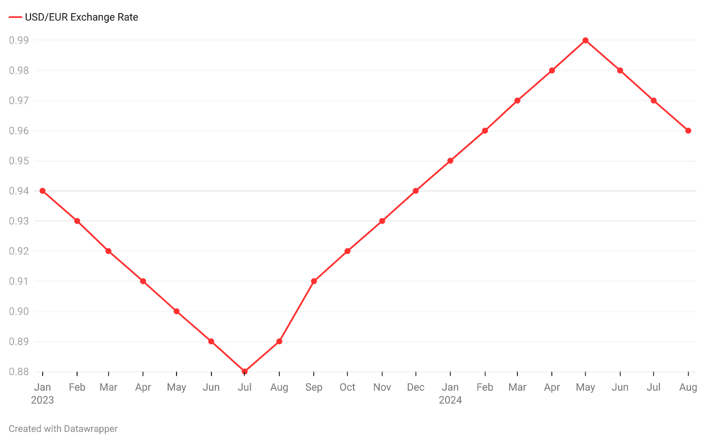 Trump ha propuesto un arancel del 10% sobre todas las importaciones, lo que podría aumentar la inflación en Europa y debilitar aún más la moneda. A esto se suma la expectativa de recortes en los tipos de interés por parte del BCE, que presiona el valor del euro, ya que reduce su atractivo frente a otras divisas. La situación pone en riesgo las exportaciones europeas y el crecimiento económico, especialmente si se materializan nuevas tensiones comerciales entre EE. UU. y Europa