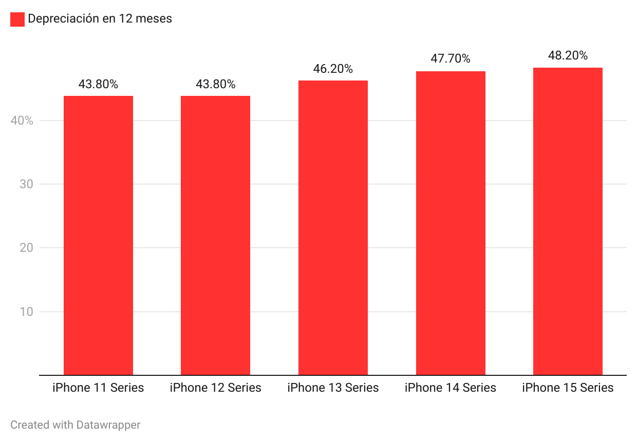 Los iPhone se deprecian más rápidamente que antes, afectando incluso al modelo recién lanzado, el iPhone 16. Mientras que la pérdida de valor promedio para los modelos anteriores, como el iPhone 15 y 14, era del 33-33.5% dos semanas después de su lanzamiento, el iPhone 16 ha perdido un 41.2% de su valor inicial en el mismo periodo. Este ritmo acelerado de depreciación representa un aumento del 8% respecto al modelo anterior y del 5% en comparación con el iPhone 12.