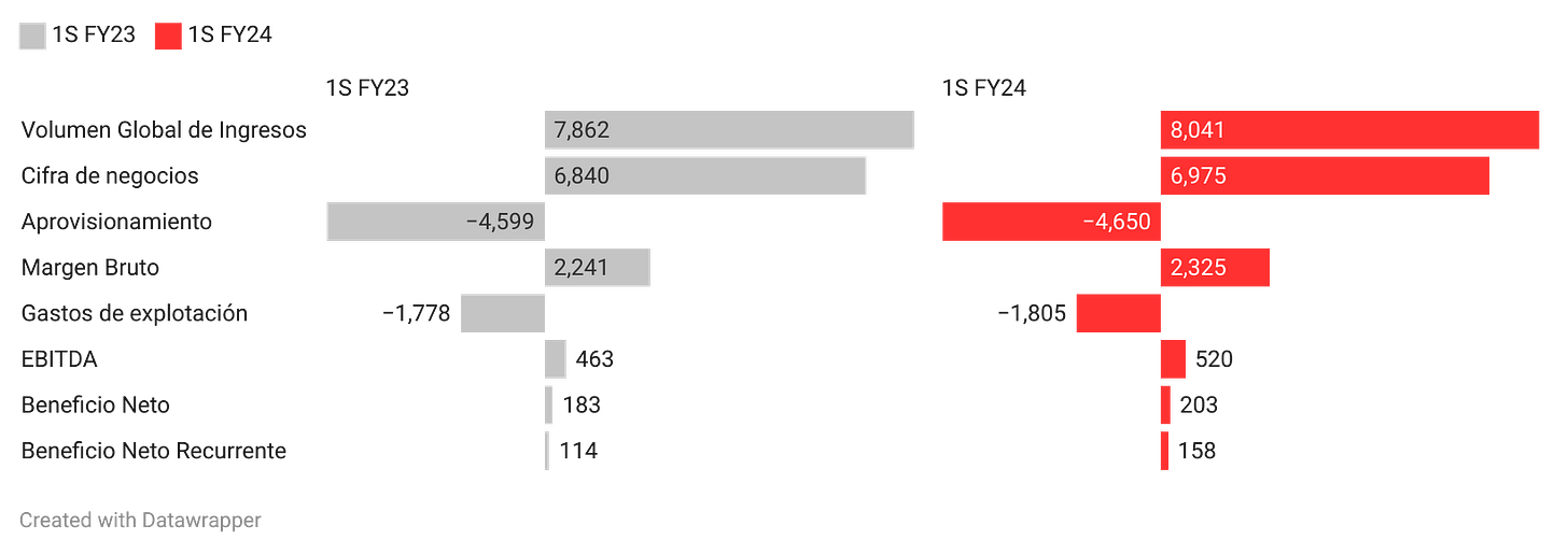 El Corte Inglés arrancó el primer semestre fiscal de 2024 con una facturación de 8.041 millones de euros, un crecimiento modesto del 2,3% (para comparar, el año pasado crecían al 5,4%). Pero antes de juzgar, espera: aunque el ritmo haya bajado, el beneficio neto de la empresa subió un 11%, alcanzando los 203 millones de euros.